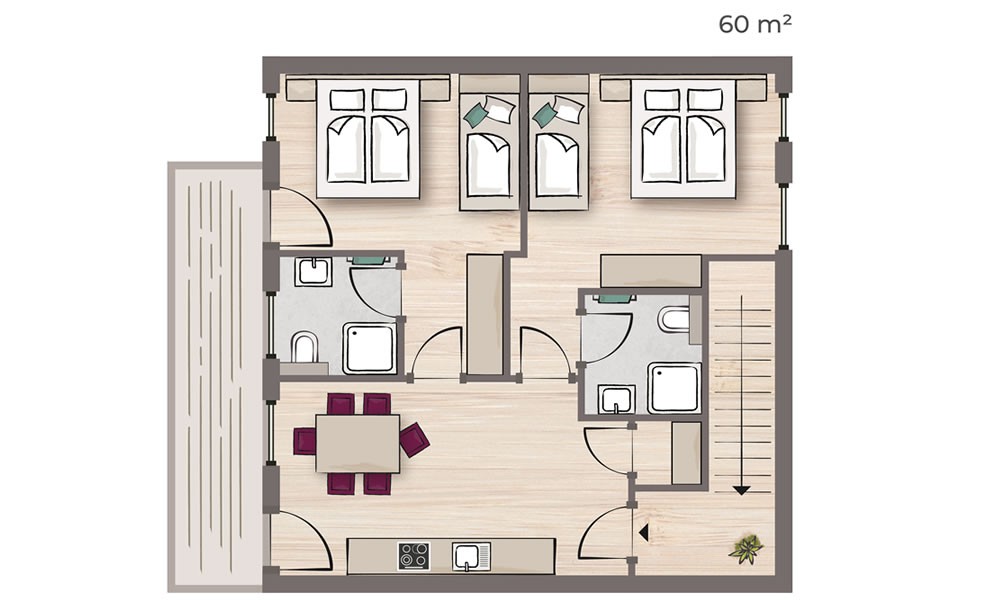 - 2 x Schlafzimmer mit je 1 Doppelbett & 1 Einzelbett